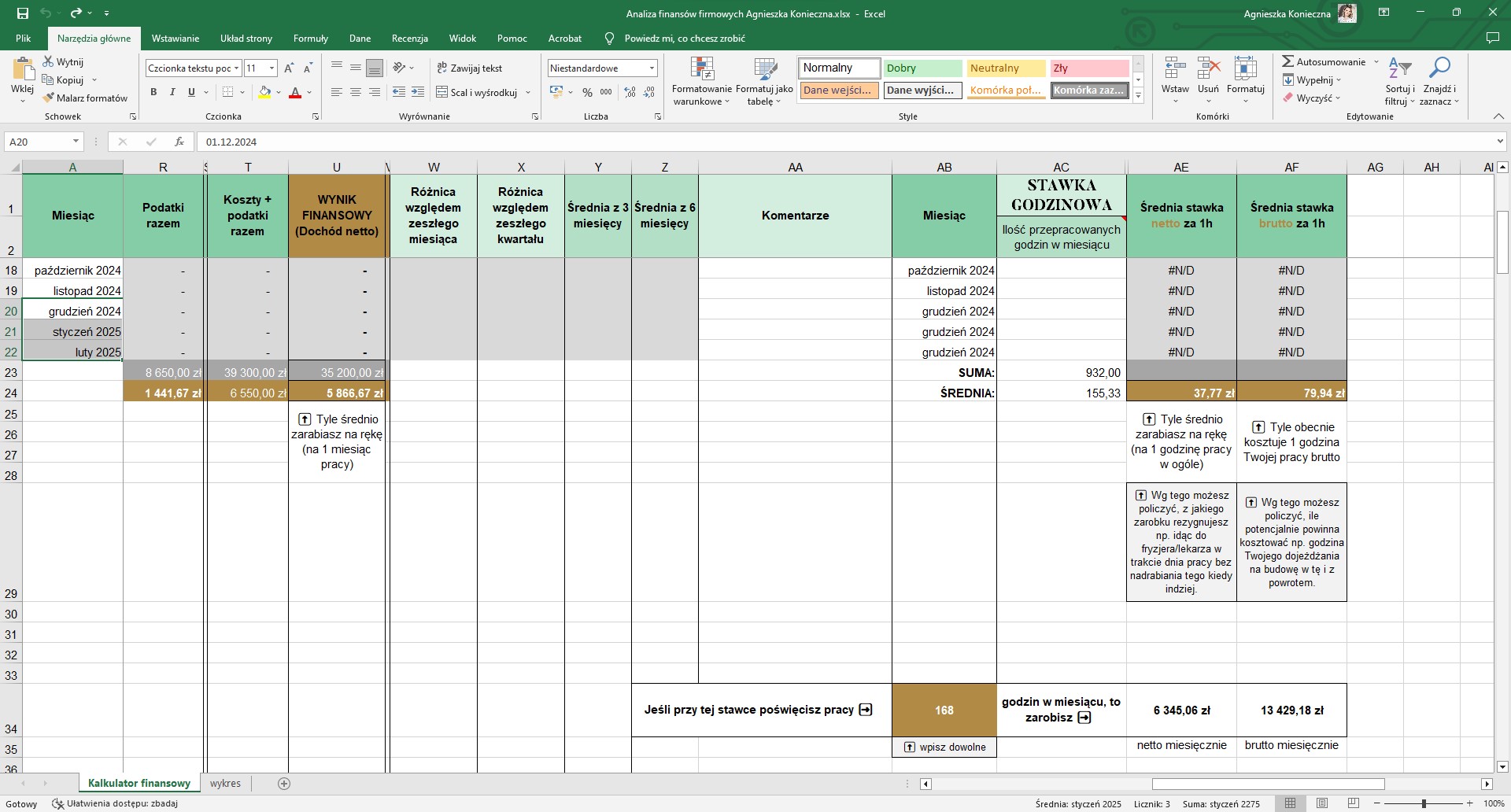 Czyli analiza finansów firmowych na podstawie przeszłych wyciągów bankowych wraz z kalkulacją, jak mają się one do czasu pracy, miesięcznych zarobków oraz stawki godzinowej. Pomaga w sprawdzeniu obecnego stanu firmy.