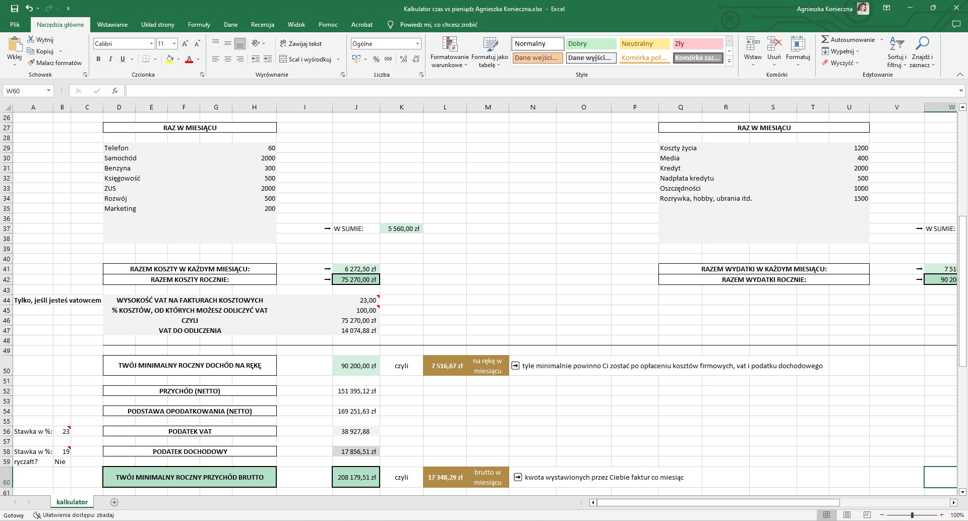 ✔ ile musisz zarobić, by pozwolić sobie na dane koszty firmowe i/lub prywatne;